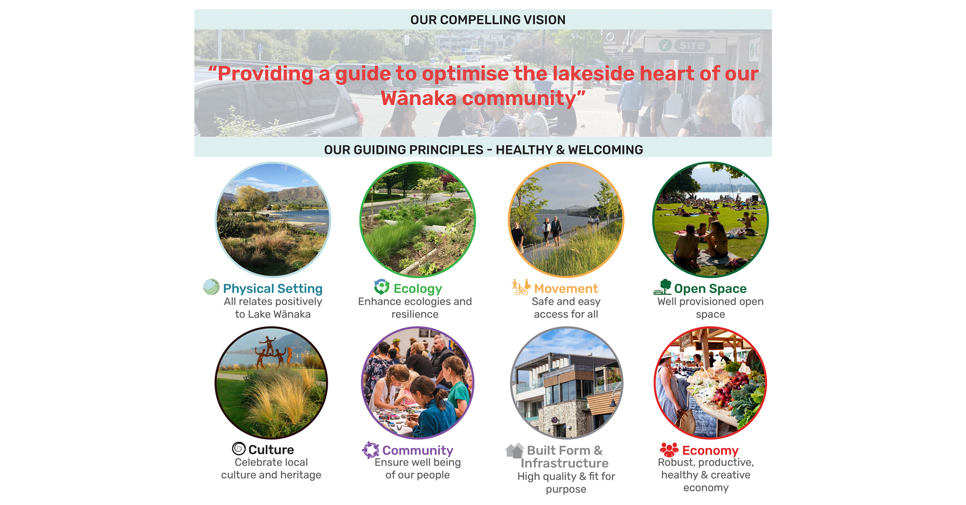 The Heart of Wānaka Town Centre Plan (HOW) report encapsulates the findings and directions, and is intended as a guide to inform future decisions and identify projects and priorities. It is principle based together with strategies across key activities and is illustrated in a series of areas showing at a high level how all of these strategies could come together.